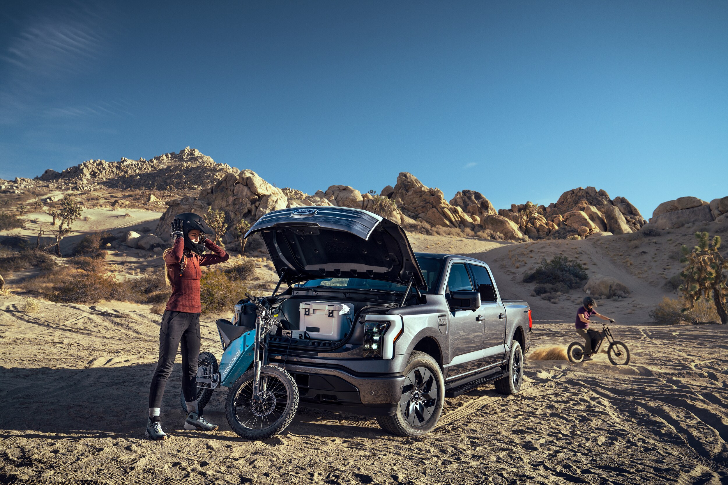 Genuine Area 51 Ford Bronco paintwork with a red starter button ensures riders know they're on a Ford electric bike. Not just any Ford; and the legendary badge proudly declares that this ebike is a Bronco.Â